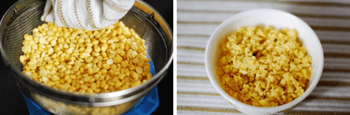 Pat dry the drained dal with a clean kitchen towel. Grind the dal in mixie for a few seconds. Please note that that the dal should be crushed and should not be made into a smooth paste.